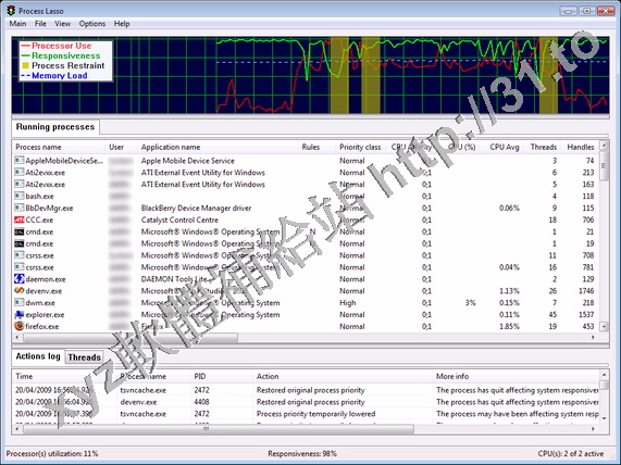 同時它還具備前台進程推進、工作集修整、進程黑名單等附加特性。Process Lasso 對您系統的優化